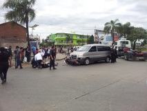 El ciclomotor quedo debajo de las ruedas delanteras del automovil mientras los dos ocupantes, un hombre y una mujer adultos quedaron sobre el asfalto. Fueron asistidos por la policía y estaban a la espera de la ambulancia para ser llevados al hospital