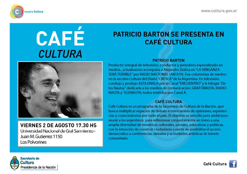 APCS-GBAN. La Secretaría de Cultura de la Nación, a través de su Programa «Café Cultura» invita a presenciar la disertación de Patricio Barton en la UNGS.
