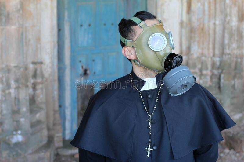 sacerdote con careta anti gas