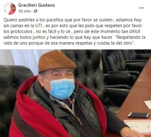 Pero hace una hora Gracilieri destacó que «Quiero pedirles a los paceños que por favor se cuiden, estamos hoy sin camas en la UTI, es por esto que les pido que respeten por favor los protocolos , no es fácil y lo sé, pero de este momento tan difícil salimos todos juntos y haciendo lo que hay que hacer