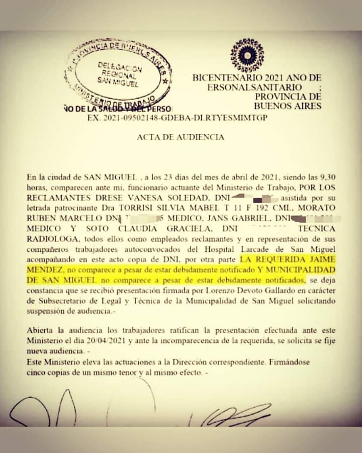 acta de ministerio de trabajo ante la ausencia de Mendez