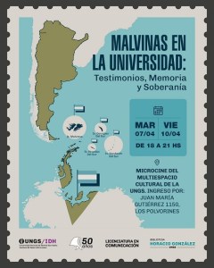 Durante los días martes 7 y viernes 10 de abril se llevarán a cabo dos jornadas de reflexión sobre Malvinas, tituladas Malvinas en la Universidad: Testimonios, Memoria y Soberanía.